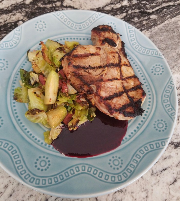 A gastrique is basically just a sweet and sour fruit sauce. This version is pretty basic (just a weeknight dinner) but you can fancy up the sauce with garlic, shallots, and herbs if you’re feeling it. The tangy sauce tasted great with the smokey pork chops, and the sweetness complimented the spicy mustard and vegetal Brussels sprouts. For a meal on the fly, it turned out super balanced!